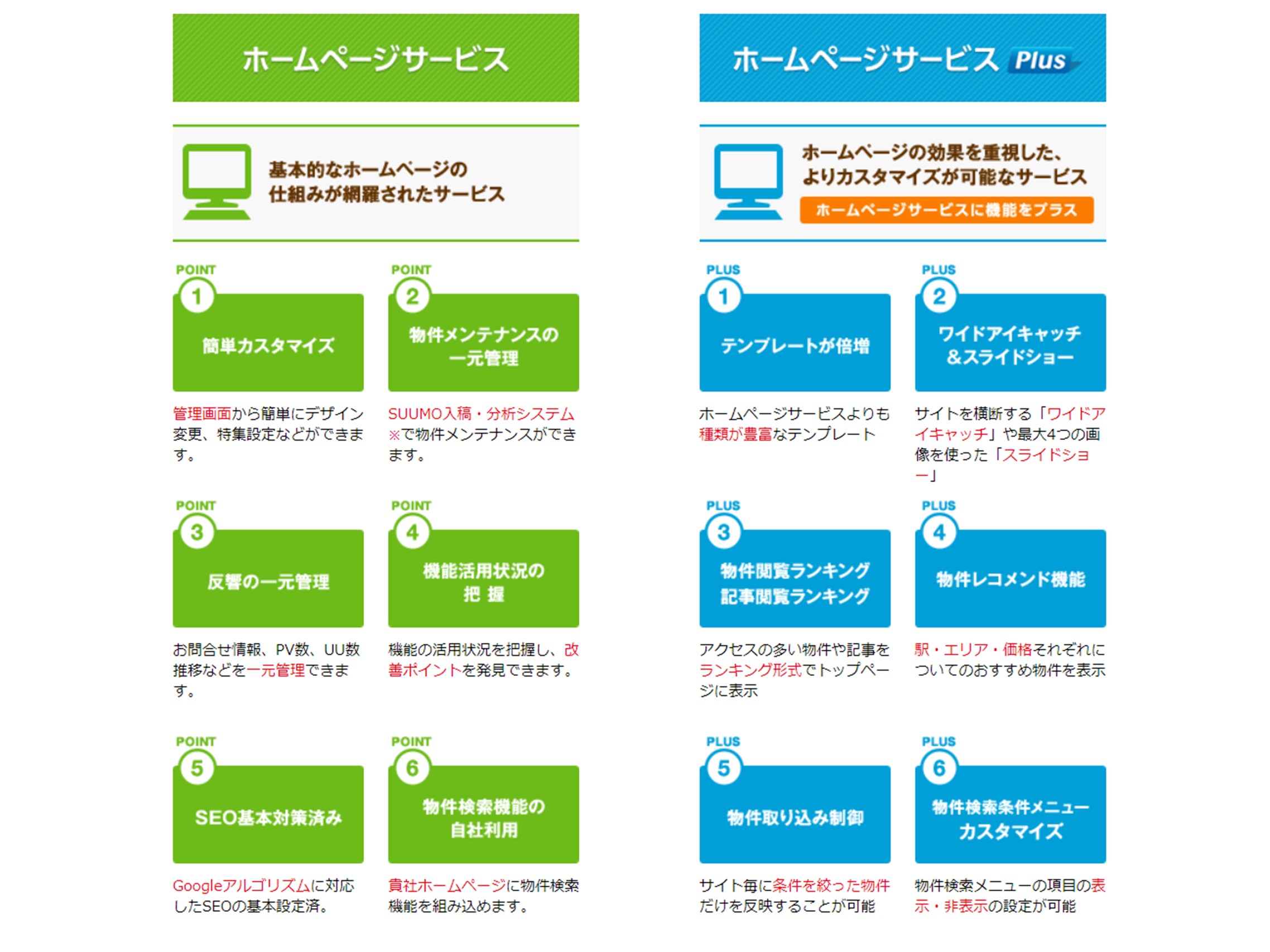 基本的な仕組みが網羅された「ホームページサービス」と、サイトの効果を重視した、よりカスタマイズが可能な「ホームページサービスPlus」がございます。