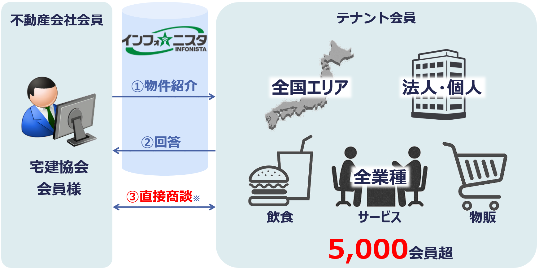 「インフォニスタ会員版」は、貸店舗物件のテナント探しに不慣れな方から貸店舗物件を専門に扱う方まで、全ての不動産会社に使って頂けるサービスです。テナント募集の場面をこれまでより効率的且つ効果的にするツールとして、宅建協会会員の皆様にご活用頂ける事を願っております。