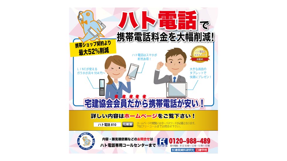 「ハト電話」は宅建協会会員だけがお得に利用いただける通信サービス(携帯・タブレット)です。全国会員10万社のスケールメリットをいかした特別料金でお得にご利用下さい。