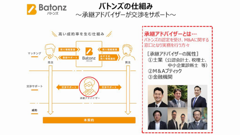 Batonzは全国で提携している約1,000の士業事務所、約100の金融機関が承継アドバイザーとしてお客様の事業承継を支援しています。承継アドバイザーは、累計成約実績4,500件を誇る日本M&Aセンターグループ、バトンズが提供するノウハウを受け継ぎ、承継後のリスクを低減した安心・安全なM&Aを行います。マッチングから成約まで、お客様と共に伴走していくことができるのがバトンズの強みです。