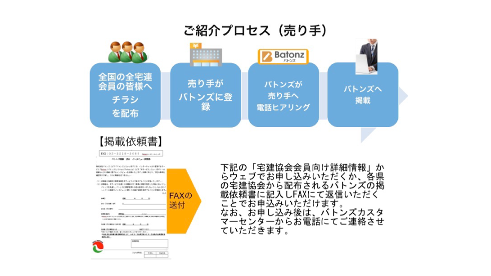 バトンズへの掲載を希望される場合は、宅建協会HPの当ページ下にある「詳細情報」から掲載への登録に進んでいただくか、または各県の宅建協会から配布されるチラシ(掲載依頼書)に記入しFAX返信をお願いします。