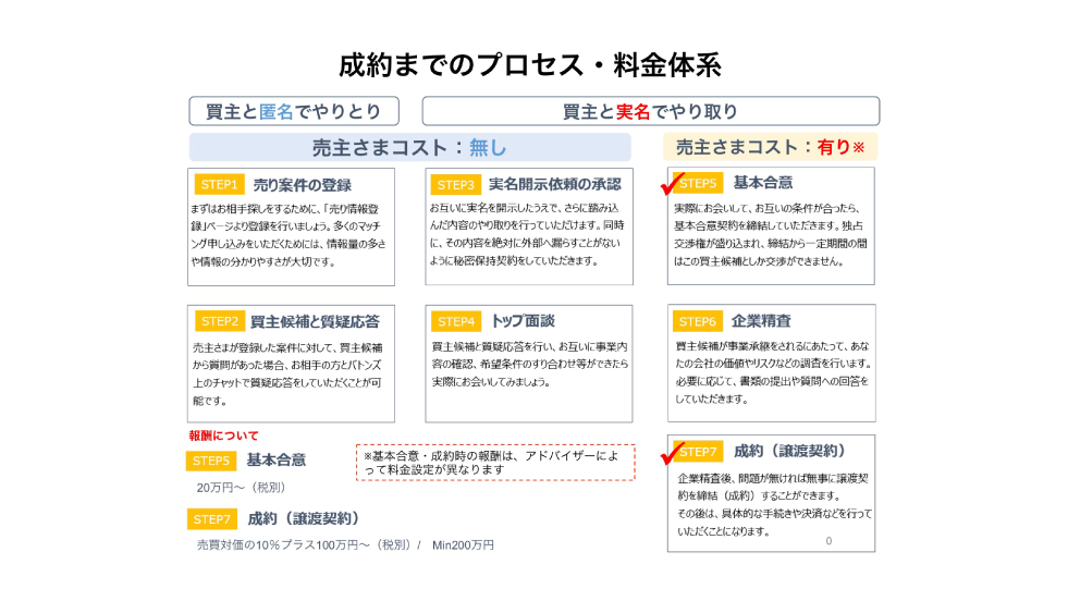 基本合意契約が締結された時点で、売り手様は20万円〜をお支払いただきます。その後、譲渡契約が締結(成約)された場合、売買対価の10%プラス100万円〜(または最低価格200万円)をお支払いただきます。