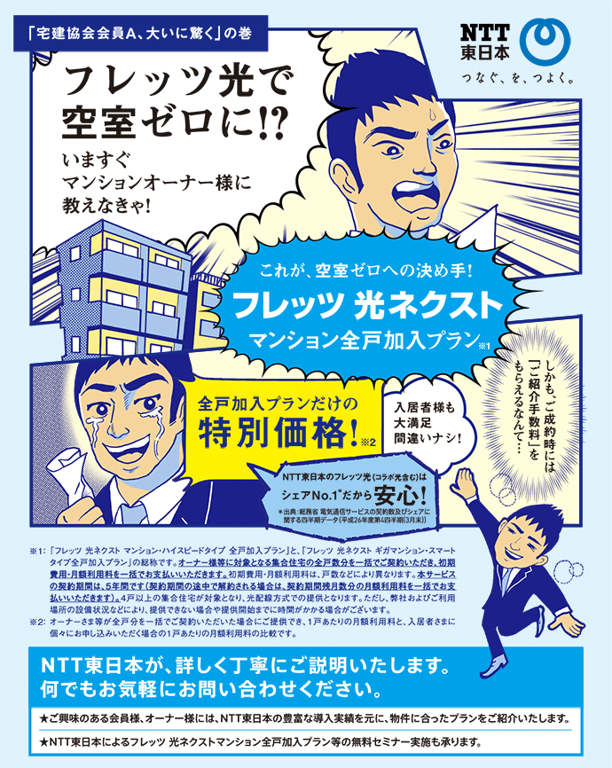 入居者に人気のあるインターネット設備を導入することにより、空室対策の一助になります。導入に際して、ご不明な点等ございましたらご連絡ください。 ※NTT東日本管轄地区(北海道、東北、関東、甲信越)限定となります。