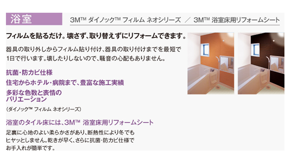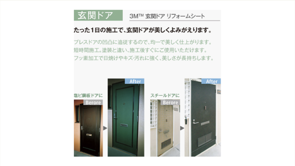 スリーエム ジャパンのリフォーム製品は、粘着剤付きの印刷フィルム。「貼るだけ」で簡単に、アパートやマンションの内装・外装をリペア・リノベーションできます。