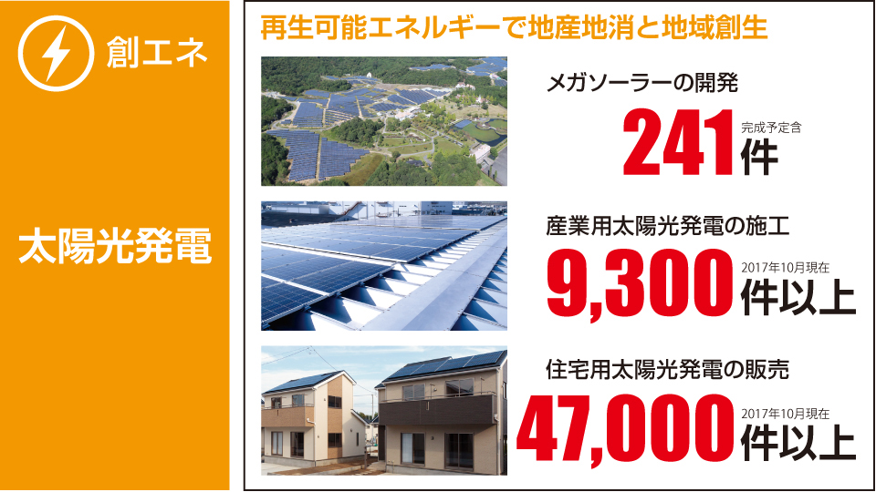 メガソーラーの開発 241件(完成予定を含む)、産業用太陽光発電の施工 9,300件以上、住宅用太陽光発電の販売 47,000件以上と、「メガからイエ」までの太陽光ビジネスの実績を積み上げてまいりました。