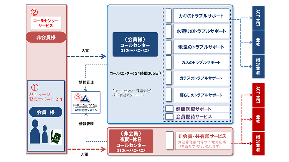 アクトコールは住宅設備の知識をもつ専門性の高いコールセンターと、全国対応可能な駆けつけ業者のネットワーク(ACT-NET)というインフラを利用した、賃貸専門の会員制緊急駆けつけサービスをご提供します。