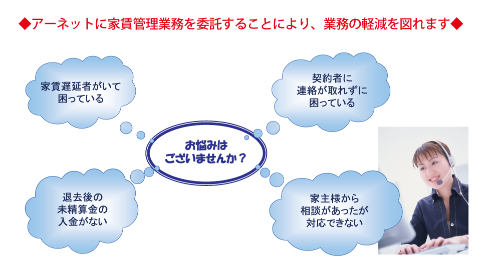 アーネットは全国で約15,000 名の家主様および約5,500 社の不動産管理会社様と、お取引の実績があります。 賃貸管理・仲介業をされる中で様々なお悩み等があり、ご解決にご苦労もあるかと思います。その1 つである家賃遅延の解決のお手伝いをしております。経験豊富なスタッフが、管理会社・家主様の為に親身になってお手伝いをさせて頂きます。 家賃は大切な財産であり、問題解決は早めの対応が何より大切です。お気軽にご相談ください。弊社は、家賃管理の向上性を目指し【家賃管理本舗】の商標登録を致しております。